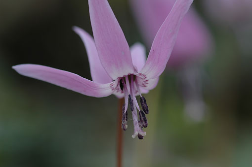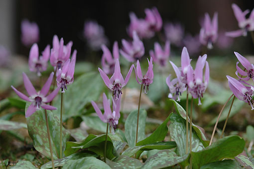山梨で探したが見つからず、東京に出てきて、多摩川の土手でこの花を見つけた。片栗粉はこの球根から取れる良質の澱粉のことで、現在はじゃが芋の澱粉を使っているが名前は残った。葛粉も今はさつま芋からとると言う。林の中にあって、木々の緑が繁り光を遮る前に花を咲かせ、養分を根に貯えて一年の仕事の大半を終えてしまう。可憐とも言えるが、生命の生存の術には感動する。 (まもる)
