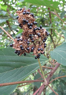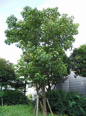 本州、四国、九州の山野に普通にみられる落葉高木で樹皮は褐色、生長が非常に速い。葉は長い柄をもち、互生し、卵形または円形で先端がのびて尖り、時に2~3裂している。枝にも葉にもこまかい星状毛があり、特に若葉では甚しい。葉柄は普通赤く、また非常にわかい葉では特に紅赤色の毛がぎっしりとおおっていて美しい。雌雄異株。夏に梢に総状あるいは円錐状の花序をつけ、多数の花を開く。この穂軸や穂の枝は赤褐色の短かい毛でおおわれている。花は小さくて、ごく短かい柄をもつか、または全然柄がないこともある。雄花は黄色、包葉は三角状線形で約3花を包み,がく片は3~4裂し,多数の雄しべをもつ。雌花は短かい花穂に密着していて、短かい柄がある。がくは3裂し、子房には3柱頭がある。さく果は外面に刺が多く、熟すと3枚のからに裂け、紫色で球形の種子を出す。