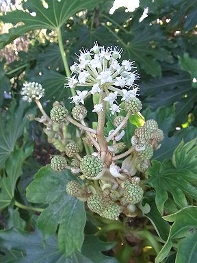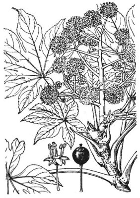 南関東以南の暖地の海に近い山や林の中にはえ、また普通人家に植えられる常緑低木、高さ2.5m 内外、茎は多くの場合数本集ってはえ、単一あるいはまばらに分枝し、ずいは白色で大きい。葉は互生し、長い葉柄によって茎の先端部に集ってつき、四方に開く。濃い緑色で厚く、毛はなく、掌状に7~9 深裂し、裂片は卵状楕円形で尖り、きょ歯がある。若い葉は茶褐色の綿毛におおわれる。秋の終り頃、こずえの葉心に大形の円錐花序を出し、初めは白い包葉に包まれるが、包葉はすぐ脱落する。中軸および花柄は白色、花柄の先に白い花の球状の散形花序を多数につけ、雌雄異花 5個の花弁、5本の雄しべ、下位子があり、花柱は5本で細く、その基部に花盤がある。果実は球形、翌年の初夏に熟して黒くなる。