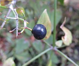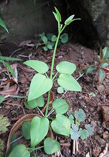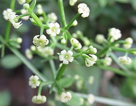 小さな草。輪生する4枚の葉っぱの形が目立つ。秋、小さな白い花が咲く。花のあとで実がなり、黒くなる。茎には小さなトゲがある。