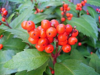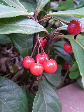 別名、薮柑子(やぶこうじ)、葉っぱはギザギザです。