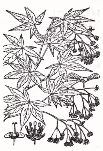 本州,四国,九州の山地に普通にみられるが,人家にも栽培する落葉高木.対生の葉はやや円形掌状に5~7に深裂し,基部は心臓形または切りとった心臓形を示す.裂片は卵状皮針形で鋭く尖り,鋭いきょ歯がある.若い時に柔かい毛があるが生長するに従いほとんど毛がなくなる.葉柄は細長くて毛はない.春に葉とともに暗紅色の小さな花を散状または複総状につける.がく片,花弁とも5個,雄しべは8.翼をもった果実は毛がなくて小さく,翼の長さは1cm位.秋の美しい紅葉を観賞し,多くの園芸品種に富む.