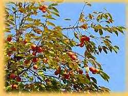 柿は日本原産の果物です。万葉集の柿の歌を探してみたが簡単には見つからなかったが、俳句には有名な句が多いので句を載せました。秋空の青に柿の赤は日本の色です。古来から柿はなくてはならない植物であった。甘味の少なかった昔、柿の甘さは貴重な甘味料ですし、渋柿からとった「柿渋」は凝固剤、補強剤としてさまざまな日本の道具を作ってきた。