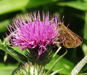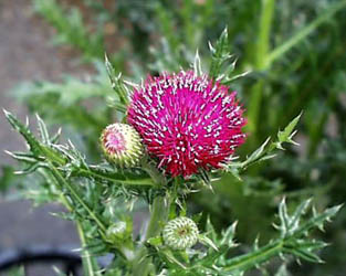 有名な「あざみの歌」はあるのだが、歌に読まれたアザミをインターネットで探したのだが、正岡子規、長節節の歌は見つけたが、古代は勿論、近世、現代に到るまであまりない。食料になるわけでもないし、重要な薬草でもなく、見栄えもぱっとしないとなれば当然のことかも知れない。しかし、外せない花でもあります。それは、僕らの最も身近な野や山のどこにでもあり、僕らに自然を感じさせてくれる花だからだ、と思います。今回この花の花言葉が「独立」という。また、棘が国を守ると言うことでイギリスの国花だそうで、平凡どころか、ふたつを合わせれば、「気位の高い戦士」といった意味になりますか、また好きになった。9月14日の誕生花だそうで、册册咲く季節は長いので、夏の花と言ってもいいでしょう。 (まもる)