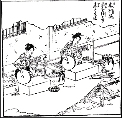 図①手ぐりによる糸取り(江戸時代までの養蚕) 図②筒胴ベルト回転による糸取り(江戸時代)