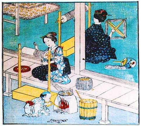 日本に関しては、弥生時代に桑も蚕も日本に入ってきていることが確認されている。しかし、江戸時代までは、国内製品は中国製品に太刀打ちできず高価な輸入品だった。江戸時代の初期国内が安定し絹の需要が増えると、日本の金の半分が中国産の絹に変わってしまった。再三出された贅沢禁止令の背景にはこういう事情があったのです。幕府は国産絹の良質化に力を注いだ。秘密裏に白く大きい良質な中国産の繭の入取 、栽培育成技術の向上、作業工具の開発等に勤めた結果、江戸時代半頃までには、中国製品におとらぬ製品に押し上げることに成功した。後期、末期には日本の主な輸出品となった。明治政府にとって生糸は貴重な外貨獲得品あり、機織りの機械化が即、産業革命を起こす原動力だったのです。