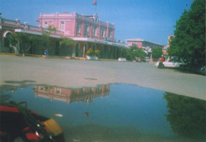 トラニは村の主道を奥へと注意深いスピードで走って行く。主道とは言っても、向こう側から来るバイクとようやくすれ違える位の幅しかない。その両側の細く浅く土を掘っただけの溝には廃水混じりの水が流れ、その向こうには同じようなバナナや果樹数本茂る小さな庭、開け放しの2階には木のベランダとトタン屋根。それが延々と続く。