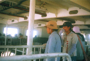 フェリーはバイク30台位と小型車7・8台ほどで一杯になる大きさだった。歩行者は無料、二階のふちに沿った階廊に登る。二隻のフェリーが着岸できる港だから、常にメコン河上には他のフェリーが行き交い、両岸の客はほとんど待つことがない。