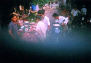 生活の苦労をにじませていない中産階級の子女らしい初々しい美男美女が、一人路上に残った僕を心配気に見下ろしている。でも僕は今日、寝る場所が見つかるまで歩くこととしているのだ。それも出来たら街外がいい。バイクタクシーの運転手が声をかけたが、僕の「歩く」という意志を感じとると立ち去った。この中州の島には強引な取引関係はない。露天の飯屋のおばさんもしごくのんびりして僕を他の客と同様に扱った。ハノイのいつもだまされているみたいな緊張が嘘のようだ。サイゴンもそうだと言うが、ベトナムの大都市では複雑に仕組んだ手を使って観光客からボル業者が辻々に待ち構えている。僕もハノイでいくら注意していても彼等のワナに何度も引っかかった。