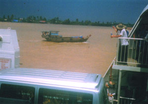 フェリーはバイク30台位と小型車7・8台ほどで一杯になる大きさだった。歩行者は無料、二階のふちに沿った階廊に登る。二隻のフェリーが着岸できる港だから、常にメコン河上には他のフェリーが行き交い、両岸の客はほとんど待つことがない。