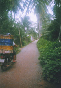 トラニは村の主道を奥へと注意深いスピードで走って行く。主道とは言っても、向こう側から来るバイクとようやくすれ違える位の幅しかない。その両側の細く浅く土を掘っただけの溝には廃水混じりの水が流れ、その向こうには同じようなバナナや果樹数本茂る小さな庭、開け放しの2階には木のベランダとトタン屋根。それが延々と続く。