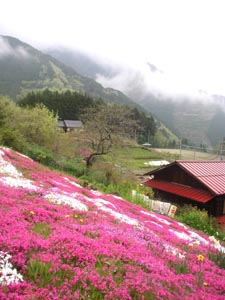 五月の連休と連休の合間、奥多摩湖の先にある小菅の温泉に出かけました。ここは大月時代から時々出かける温泉です。五月初めの乾燥した青空ではなく、しとしとと梅雨のような雨が降っています。おかげで、淡い緑はみずみずしく輝いています。八重桜も咲いていて二週間遅くれ春です。ピンクの芝桜と山里をカメラに納めることができました。今日は観光客はまばら、ゆっくりお湯に漬かることが出来ました。 (まもる)