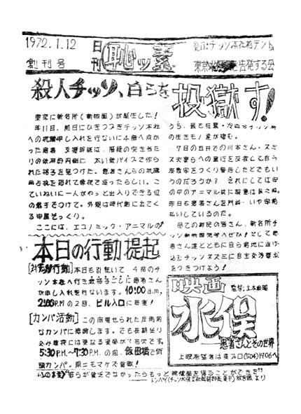 上は、71年12月に始まった座り込みも、膠着状態となり、僕らもやることがなくなった。明けて72年一月から、僕らの中心メンバーだった。真板さんが中心なり作り始めたチラシ。新橋の事務所でガリ版刷り、作り、朝みんなで東京駅でくばった。