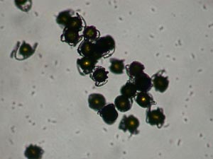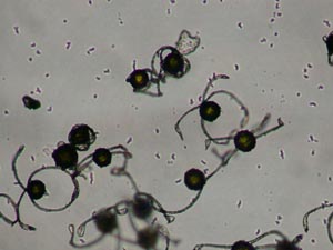 春早く地下茎から、胞子茎(つくし)を出し、これは淡褐色の平滑で軟かい円柱茎で、高さ10cm~25cm。先が歯片状に裂けたさや状に退化した葉を節から生じ、小枝ははえない。茎頂に長楕円体の胞子穂をつけ、たて状六角形の胞子葉を密生し、胞子葉の下面に数個の胞子嚢をつけ、中に淡緑色の胞子を生ずる。胞子には4本の弾絲がついており、湿めれば、巻き、乾げばほどける運動をする。