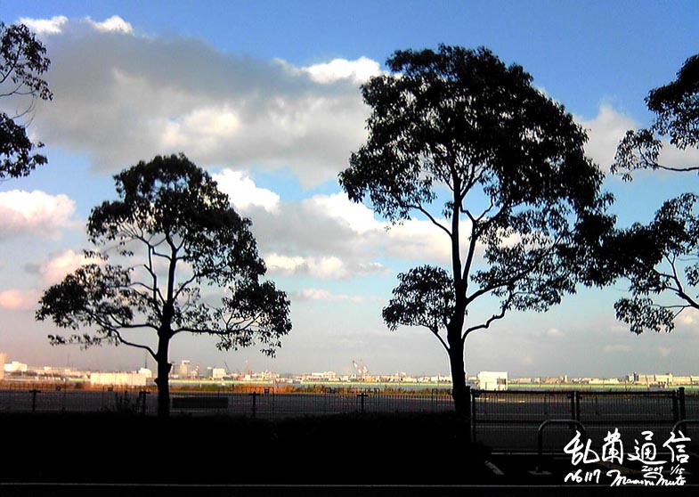 晩秋の東京の埋立地、有明の国際展示場から新木場方向の携帯写真。この辺で気に入った写真スポットはないのですが、この日はよく晴れ空気が澄んでいて、空がきれいだったので、大工仕事の休憩時間とったものです。(M)