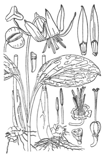 北海道、本州、まれに四国の山中にはえる多年生草本、根茎は白色多肉の鱗片状で数個がつずいて地中深く横たわっている。鱗茎はゆ合して筒状となって根茎の先から直立し、長さは4cm内外あり、皮針形の柱状をして白色で厚みがある。早春に 15cm 内外の茎を1本出すが下部の方に1対の葉がある。葉には長い柄があって平開し、狭卵形または楕円形で両辺には多少の波曲があり、まれには地にしいているものもある。葉質は厚くやわらかく表面は淡緑色で紫色の斑絞がある。花は茎頂に只1個で柄の端で急に下を向き、径4~5cmで紫色でかれんである。花被片6個はせまい長皮針形、先は尖り強くそり返っている、内面の基部近くに濃紫色のW字の紋がある。雄しベ6本は長さが少し不同でやくは紫色、長さ6~8mm、広線形、柱頭は短かく3裂する。鱗茎から良質のでん粉が取れる。しかし普通町で片栗粉といって売っているのはジャガイモのでん粉である。