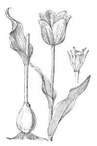 小アジア原産の多年生草本でヨーロッバを経て輸入されたもので観賞用として広く栽培される。園芸品種は中々多い。鱗茎は卵形、茎は円柱形で直立し単一である。葉は2〜3枚を茎の下部に接した所に互生し、広い皮針形または楕円状の皮針形で長さは20〜30cmある。先端は尖り、基部は軽く茎を抱いて、全体に少し内側に巻き、ふちは少し波うっている。表面はうすい青緑色で白い粉をふいたように見えるが裏面は濃緑色である。4〜5月頃、茎の先に上向きに大きい花を開く。花は広鐘形で長さ7cm内外あり、花被片は平開しない。花の先端は大きく丸みがあるが基部は凹面で広い。原種は白色で赤くへりどったものであるが、黄、白、赤、紫等の色がある。雄しべ6個、雌しべは長さ2cm内外で緑色の柱状、先に急に外方へ曲った骨質の柱頭が3個ある。