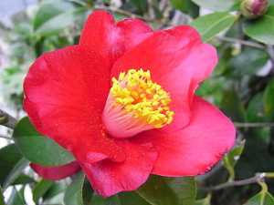 もっともよく見かける椿。花は大きくやや筒型。花ごと散る。 花びらは厚みがある。別名「山椿」 |