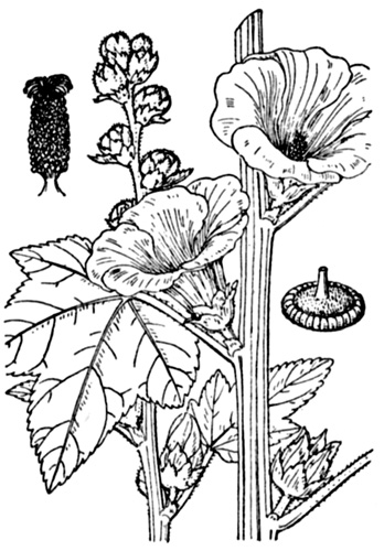 小アジア(または支那ともいう)の原産で、普通人家に栽培してその花を観賞する大形の越年生草本で高さは2.5m内外になる。茎は円柱形、緑色で毛があり、高く直立する。葉には長い葉柄があり互生し、円形で基部は心臓形、5個ないし7個に浅く切れ込み、ふちにはきょ歯がある。6月梅雨の頃葉腋に短かい柄のある大きな美しい花を着け、下から次々と咲き上り、こずえの部分では長い花序となる.小包葉は7~8個あり基部は互にくっつく。がくは五つに裂け花弁は5個、ラセン状に捲き,鐘形で上半は開出し、色は紅、濃紅、淡紅、白、紫などで、また八重咲もある。単体雄しぺの柱にはやくが密集し、花柱は1本で上部は多数に細かく分かれている。心皮は輪状に並ぶ。昔一般にアオイと呼んでいたのはこの植物を指していたことが多い。