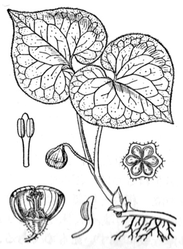 山中の樹かげにはえる多年生草本。茎は多肉で平滑な円柱形、汚紫褐色、径5mm内外、地上を横たわり、長い節間と2~3の短い節間とが交互し、下面からは細いひげ根を出す。春、茎の先端に2~3の鱗片が互生して、扁平な芽となり、のちに芽の中から長い1本の茎がのび先端に2枚の葉が接近して互生する。葉には長い柄があり、直立し、散毛が立つて生え、葉身は心臓状腎臓形、長さ4~8cm先端は短い尾状で急に尖り、基部には半円形の両耳があって深い心臓形となり、全縁であるが長い毛が列生し、薄質である。葉間に柄のある花を1個下向きにつける。花は淡紅紫色で径1cmほど、子房下位で子房とともにがく筒の外面には巻縮毛が生える。がく筒はわん形で内部は平滑,隆起は全くない。がく片3個は無毛,強くそり返えりがく筒の外側をおおっている。花柱は合して単柱状、先端は分裂して6個の柱頭となる。おしぺは12個、花糸は長く、外方へ曲がっている。