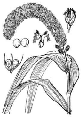 古く日本へ渡来し、今は全国いたる所の畠に栽培されている強壮な一年生草本で、高さ1~1.5m位ある。茎は単一で直立し、粗大な円柱形となり平滑である。葉は皮針形で、先端は次第に尖り、質はやや厚く縁に細いきょ歯があり、下に葉鞘を具えている。秋、茎の頂に単一な花穂を立て、一方に傾き、非常に大型で長さ15~20cm位、円柱形で多数の小枝を分けて無数の小粒形の小花を密集する。1個の枝穂は1花と不稔花穎とを持ち、長い剛毛、あるいは短かい剛毛を具え、小穂は1花からなる。第1包頴は小さく、第2包穎と護頴はほぼ同形、同大。第2包穎と護頴には光沢があり芒はない。雄しぺと雌しぺがある。頴果は小球状で黄色を帯びている。本種の内、モチアワは穀粒に粘り気があり、またこの外にネコマタ、ネコノテあるいはネコノアシ(var.ramifera Makino)と呼ぶものがある。穂の末端がわかれて数条となる。