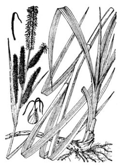 沼沢水辺の地にはえる大形の多年草で、また往々水田に栽培される。茎は多数叢生し多くは群落をなし高さ1m内外ある。根茎は短かく粗な地下茎を泥中に横走する。茎は直立し太いが鋭い3稜柱でざらつき、脚部には褐紫色の鞘状葉がある。葉は根生して茎に互生し、葉鞘の内側は網状の繊維に分裂し、葉身は幅広い線形で幅は5-8 mm位,平滑で強靱である。5~6月頃茎の頂に長さ5~8cm位の広線形汚紫褐色の雄花穂を着け、そのやや下方に2~3個の円柱状雌花穂を斜めに出して着ける。雌花穂は長いものは10cmを超え、最下のものは、顕著な包を伴い、往々先端は雄花部となることがある。雌花の鱗片は卵状皮針形で鋭く尖り、紫褐色、縁は白色、中脈は緑色。果胞は僅かに鱗片より長く卵状皮針形、先は鋭く尖り無毛。柱頭は3個。