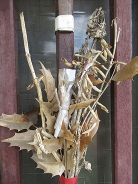 柊に魚の頭を刺して魔除けにする風習が記されています。これは、鬼が村に入ってきて空腹のあまり村人を食べようとしたが、柊の葉の棘で目を刺されて退散したという古い伝説にもとづいていいます。今でも節分の行事として受け継がれています。