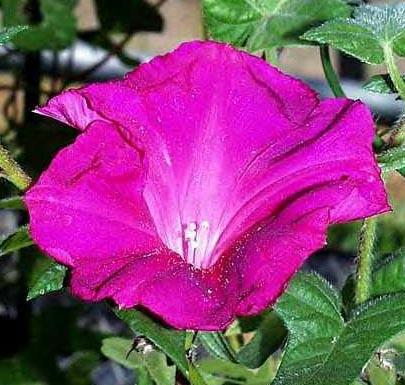 アジアの原産で.最も普通に栽培される一年草である.茎はつる性で逆毛があり,左巻きで他物にまつわり,長さ3m以上になる.葉は互生し長い柄があり,普通は3裂し葉面には毛がある.夏,葉腋に大形の美しい花を開き,早朝に咲き午前中にしぼむので朝顔という,花は一カ所に1~3個つける.がくは深く5裂し,裂片は細長くとがり,背面に白色の長毛がある,花冠は漏斗状で径10~15cm,大きなものは径23cmにもなう,青紫色,白色,紅色,ふちどりのあるものなど数多い.つぼみは筆頭状で右巻きのひだがもる.雄しべは5本,雌しべは1本.果実はさく果で残存がくをつけ,球形で3室おり,各室に種子が2個ずつ入っている.種子は薬用とし牽牛子という.観賞品として広く栽培され,葉や花に多くの変化改良が加えられている.