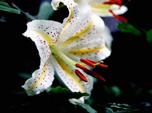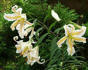 盛夏の頃、茎の先に数個の豊大な美花を開き強い香気がある、径15~20cm、椀状鐘形に開ぎ、白色で内面に赤い小点を満布している。花被片は卵状皮針形で先端は外にそり返り、基部がせばまった爪にならないのはユリ属中本種だけである。中脈にそって黄色くなり基部は深く落ち込んでその附近には短柱状の突起が一面にある。雄しべ6個は花被と同じ高さでやくは長さ2cm内外あり、暗紅褐色で花粉は黒褐色である。