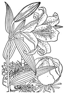 本州中部から北の山地にはえ、また人家に栽培する多年生草本、茎は高さが1~1.5mくらいで直立しているが花が開くと花の重味に従って少し倒れるものが多い。鱗茎は大形で、径10cm 内外あり、扁球形で鱗片は卵状皮針形で厚みがありまた黄味がかっている。