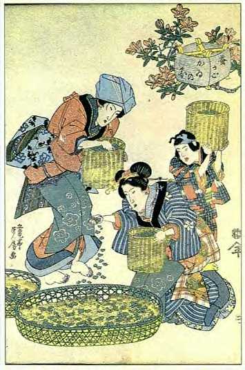 日本に関しては、弥生時代に桑も蚕も日本に入ってきていることが確認されている。しかし、江戸時代までは、国内製品は中国製品に太刀打ちできず高価な輸入品だった。江戸時代の初期国内が安定し絹の需要が増えると、日本の金の半分が中国産の絹に変わってしまった。再三出された贅沢禁止令の背景にはこういう事情があったのです。幕府は国産絹の良質化に力を注いだ。秘密裏に白く大きい良質な中国産の繭の入取 、栽培育成技術の向上、作業工具の開発等に勤めた結果、江戸時代半頃までには、中国製品におとらぬ製品に押し上げることに成功した。後期、末期には日本の主な輸出品となった。明治政府にとって生糸は貴重な外貨獲得品あり、機織りの機械化が即、産業革命を起こす原動力だったのです。