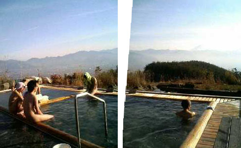 年末、正月は近くの温泉三昧でした。ここは山梨市フルーツ公園の上にある「ほったらかしの湯」という所。温泉はお湯の質もあるけど、周りの環境です。携帯電話のカメラなので鮮明じゃないけど遠くに富士山が見えます。ここは、甲府盆地、富士山が一望できることで人気があります。 桃の季節になったらまた行ってみよう。