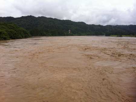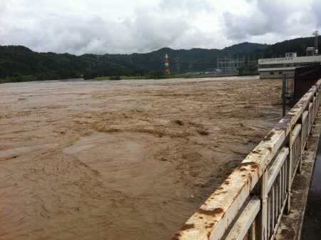 集中豪雨で阿賀川水位は危険な状態に、ここはダムの下流方向です。
