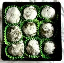 小分けして、平たく伸ばしアンコを包み丸くします。ここで餅米粉をかけ表面の水分取っておいた方が粘りがとれて扱いが楽でしょう。