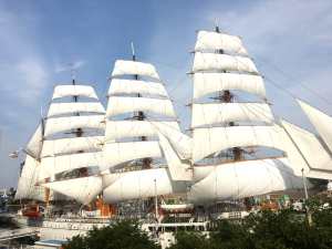 日本丸が穂を広げるのは珍しい。今日は海の日。