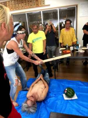 写真はスイカ割り、すぐに即興の遊びが入る。