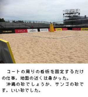 現場は江東区青海、ビーチバレー会場の看板付け。仕事としては楽な仕事なのですが。海端だから内陸よりは温度は低い。海風もひっきりなしにふいている。でも動き出すと、汗が全身から噴き出してくる。1~2mの高さでは35~6℃でも、地面近くは40℃を軽く超えていたでしょう。