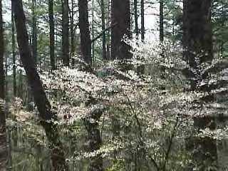 そこから引き返し、青木ヶ原樹海の中を通り鳴沢村に抜け、別荘地の立ち並ぶ林の中に入った。あるではないか、富士桜が、それも今が盛り、みんな低い灌木ばかり、低い奴は1mから高くても5~6m。まだ芽吹きも始まっていない殺風景な林は、染井吉野などの饒舌な花とも違い、山桜よりもひかえめな花が点々と、更に進むと林いっぱいに淡いピンクの小さい花を付けている。そうこの桜、山桜の一種で小桜の仲間で花弁がひとまわりちいさい。さらに富士山の周辺しか生息していない珍しい品種なのです。