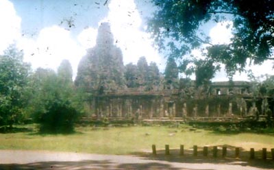 昨日は遠出をし過ぎて帰りが遅れ、闇夜の密林を抜く道を怖る怖るペダルを漕ぐ羽目となった。ようやく出逢った最初の灯が、土産物部落の赤い石油ランプの群れとその中心に輝いていた、小さな壁のない寺の床に立つ数本の蝋燭だった。彼女はその白い光に反射する金色の仏像に祈っていた。寺の脇に自転車を止めた僕に向かっても祈ってくれた。夜も更けた頃だったのに寺の廻りには多くの子供達が遊びまくっていた。そして最後に彼女は上に向かって祈った。仰ぎ見ると、空を覆った薄雲がその上にきらめく星に芒と光り、バイヨンを淡く照らして宇宙的な燈台のように見せていた。その全てがあまりにも幻想的な光景であったために彼女の実在も信じられないままだったのだ。