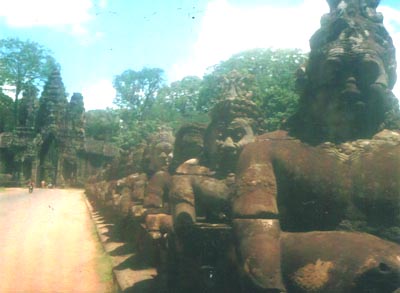 広大なアンコール遺跡地帯の中心部を歩いて巡る2つのコースがある。大回り外側一周コースの方は10キロ余り。途中の巨大遺跡内部の旅も含めれば20キロは軽く越える。でも(コース出発点のアンコールトムに早朝自転車で到着すればこなせるだろう。)と例のごとく朝市の人声ワイワイ立った直後「レッツ ゴー」の掛け声かけて宿を出る若い旅人達の勢いに飛び起きた。それが、今朝の4時半だった。そして近くの貸自転車からサドルに跨がったのだが(いけねえ)昨日のサイクリングの帰路、闇夜の密林を抜く道に迷って宿に戻ったのは夜中過ぎ、その疲れと睡眠不足がたたっている。午前五時半に開門するシェムリアップ市郊外の入場券チック・ポイントまでは彼等の後に附いて行けたが、開門するや落ちこぼれた。アンコールトムまでの23キロはトロトロ道の左端を見つめるだけの夢遊状態の上に途中で陽は樹冠を越えた。今日もモンスーン最盛期にヒョッコリ出現した蒸れて暑い日だった。だからもう、ウォーキング・コース出発点の南門に駐輪した時には既にクタクタのグチョグチョだ。