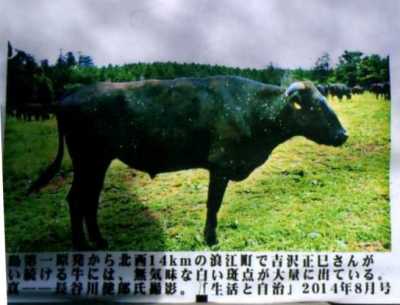 フクシマダイイチから14kmの浪江町の牧場で撮影された白い斑点のでた牛。