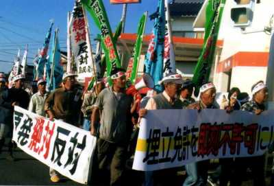 山口県上関町 フクシマ事故四年目の町内デモ。31年間原発建設計画をとめている、祝島島民を主として闘い続けているが、漁業権の売却がかろうじて抑えられた状況だ。