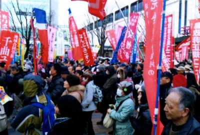 群馬県高崎駅前の3.11事故4年目集会。この地方の労組強し。その前に市民公園で多彩な文化表現が行われた。僕には群馬のお母さん達が反原発替え歌とAKB48並の踊りを披露したスパンコール歌舞団、そして福島からいわき市女子高校生生のフラダンスチームが感動的だった。