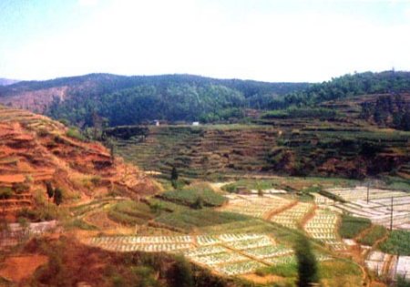 05年2月 雲南省山岳部。 時には天まで昇る野菜の段々畑。水が引かれた場所では、一枚一枚の水田に満月が写るというような風景も見られるという。日本の一時代前の人情やコミュニティーを感じる山間である。 |