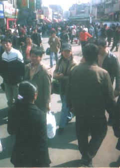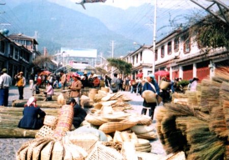 05年2月 大理市郊外の少数民族マーケット。 山に囲まれた大理の町の郊外。新たに都市計画された山の手の住宅街のメインストリートで毎週木曜日に近くの山岳地帯から少数民族手造り実用品の路上マーケットが開かれ |