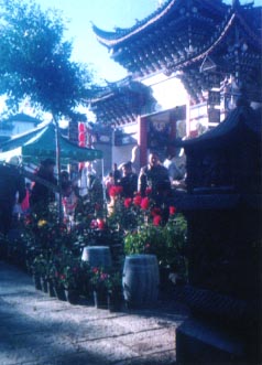 05年2月 大理市内 花のマーケット 白い衣装はチベット系白族(ぺー)の女性で観光客の記念撮影用。 |