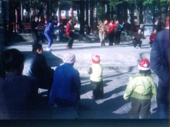 05年2月 大理市内 大理市城壁内の寺の広場。踊りのレッスン。 |