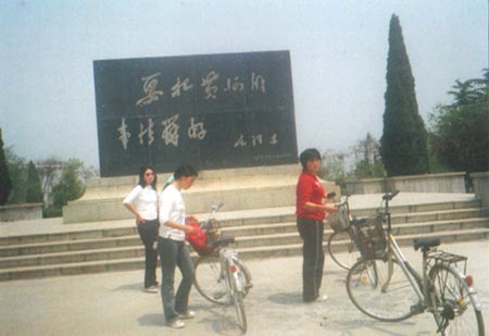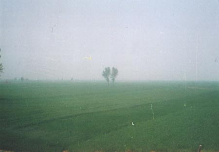 開封市 市の郊外に、黄河を訪れた。水の少ない季節は河床で麦を栽培している。このずっと向こうに黄河の水流があるが、あまり遠いので行きそびれた。 |