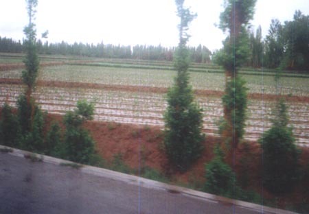 敦煌 突如緑が現れる。人間が営々として維持してきた農地オアシス敦煌(トンコウ)は、シルクロードのキャラバンルートでもあった。 |