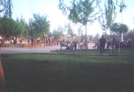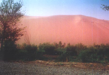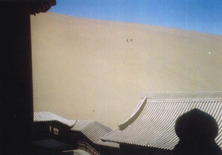 敦煌 町の郊外には巨大な砂丘が迫ってきている。だがこの町は他のシルクロードに消えたオアシスのように呑み込まれたことはない。奇跡的に風の向きが町から外れているのだろう。 |